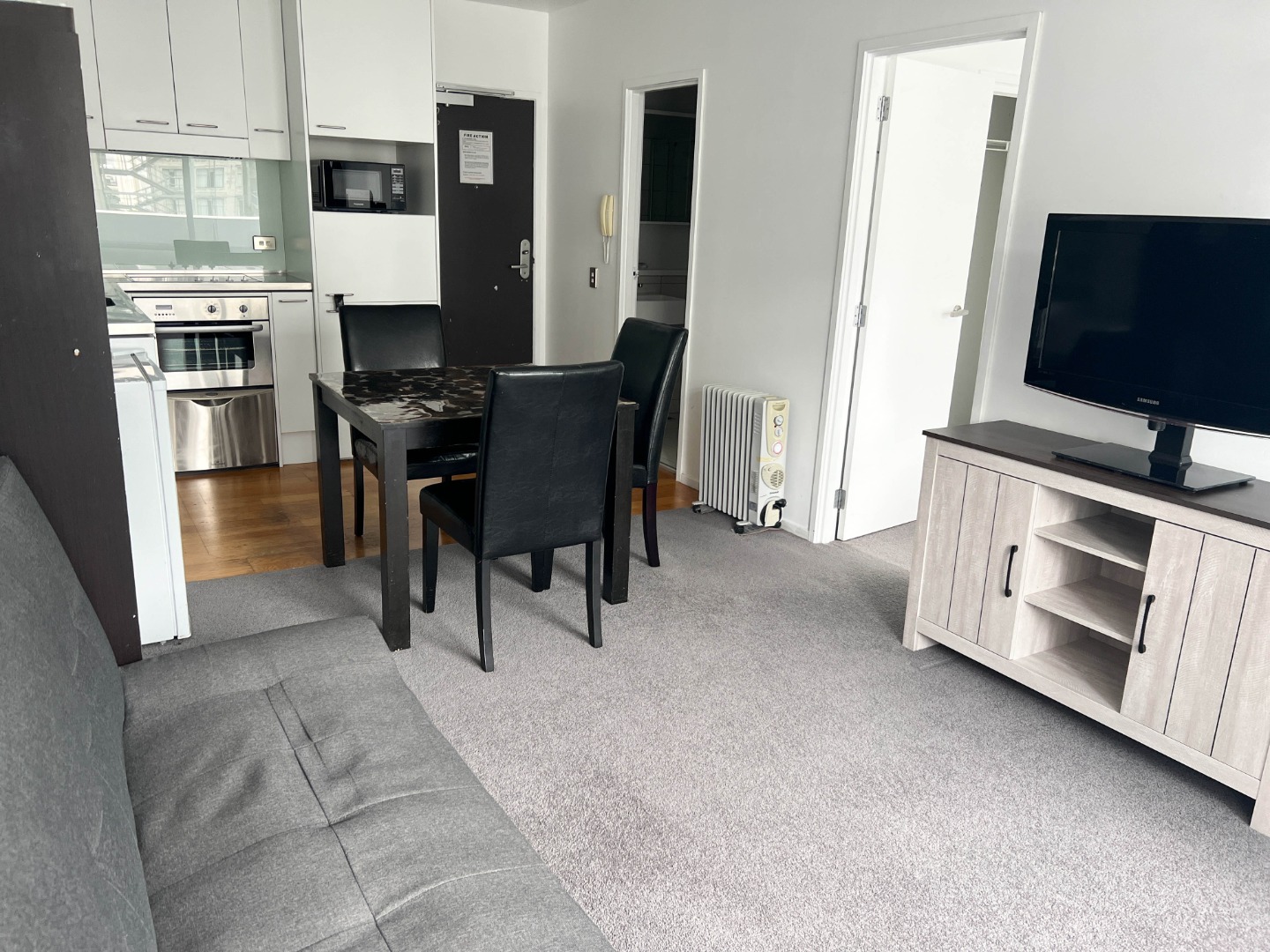 Chattels include: washing machine, dryer, queen size bed with mattress, bedside tables x 2, display unit, fridge, freezer, dishwasher, TV stand, TV, sofa bed, dinner table with 4 chairs, microwave